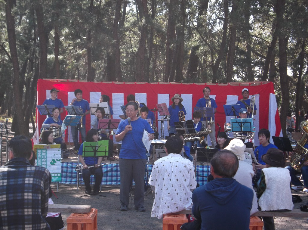 毎年定期演奏会前の恒例イベント、焼津市大井川地区吉永の海岸にほど近い松林の中にある公園で、今年も「月の沙漠 ふるさと祭り 松林音楽会」にお呼び頂き、団員24名で参加いたしました。